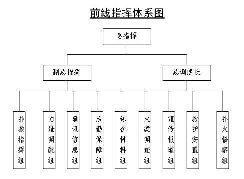 4.扑救指挥组:负责火场情况调度,协调组织扑火力量,落实具体的扑救措施。火场扑灭后,负责火场的检查验收。